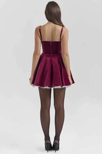 FREE DELIVERY ON YOUR ORDER Description Meet ‘Minimoiselle' in our spectacular seasonal velvet. She's a sumptuous burgundy-hued mini dress that’s ready to steal the spotlight and turn every occasion into a soirée. This stunning piece features a cupped corseted bodice, perfectly sculpted to hug your curves and enhance your silhouette,…