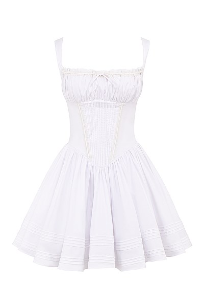 FREE DELIVERY ON YOUR ORDER Description Cut from lustrous organza jacquard, 'Nerissa' is delightfully feminine in white. It has a pretty sweetheart neckline, enhanced with underwired cups and the corseted bodice sculpts and shapes your waist to perfection. The voluminous mini skirt is flirtatious and floaty that's luxuriously lined with…