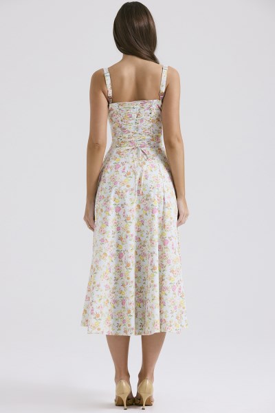 FREE DELIVERY ON YOUR ORDER Description You'll feel ultra feminine in our 'Carmen' dress that's the perfect fit for Spring and Summer garden parties. It's cut from a stretch cotton-rich fabric in a gorgeous ivory Meadow print and has a corseted bodice to cinch the fit with a beautiful lace…