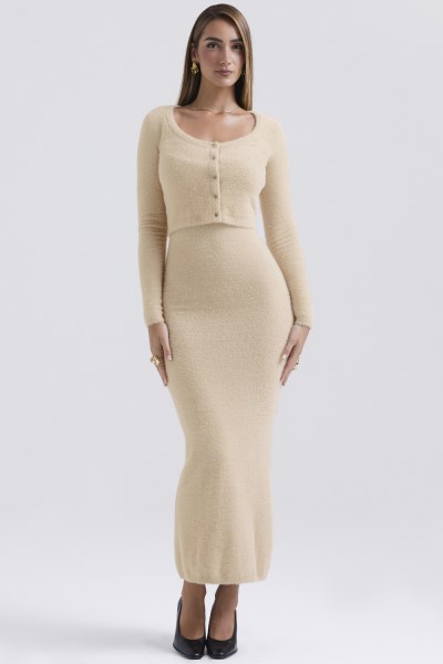 Our 'Gene' cardigan is cosy, chic and super versatile. The soft fluffy knit creates a brushed effect, making 'Gene' super comfy to wear. It has a rounded scoop neckline and a classic button front in a flattering close fit. Layer yours over our 'Fayette' dress in beige for the perfect match. We recommend folding our knitwear as it will stretch on a hanger.