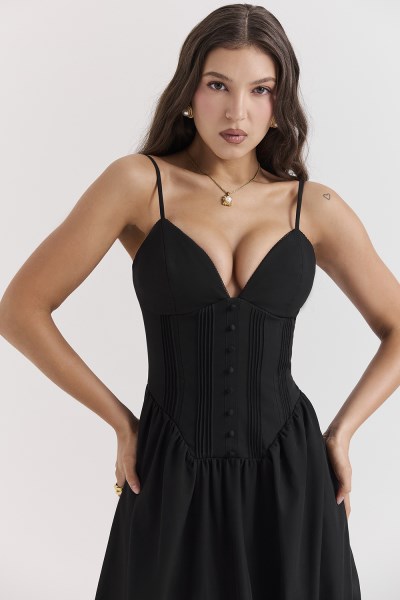 There's a sense of romance about our 'Lova' dress that makes it feel so chic for the perfect date night. Cut from a twill fabric that has a light stretch, it has a plunging sweetheart neckline and a perfectly boned bodice to cinch the waist. We love how 'Lova' has pockets and a softly pleated skirt. The dainty straps adjust for the perfect fit and it zips to the back for easy on. Wear yours with our 'Lola' or 'Paris' heels in black. The 'Regular Cup' option suits cup size A-C whilst the 'Bigger Cup' option suits cup size D-E. WHERE TO WEAR: