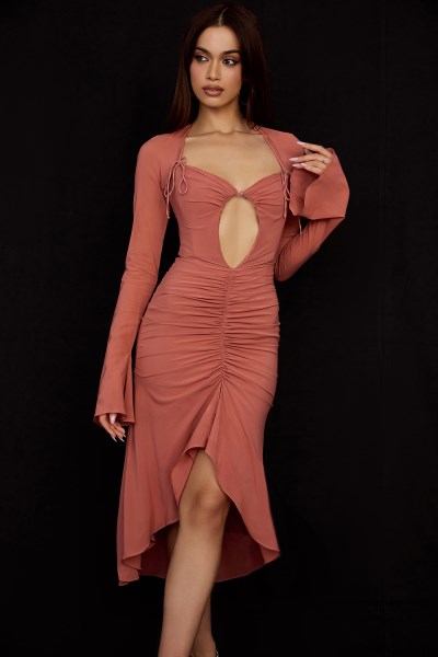 Delicate ruffles, a sexy cutout and luxurious fabric makes our 'Reine' midi dress as romantic as they come. Cut from our lightweight georgette fabric that is made with real silk so it's beautifully fluid. 'Reine' features a pretty sweetheart neckline with a halter neck strap and delicate bows to the bodice with a generous cutout to the front, framed by elegant fluted sleeves. The gentle gathering is figure flattering and we especially love the cascading ruffle draped hem to reveal a flash of leg with a fluted hem to the back. It has a zip and button fastening to the back and the body is fully lined for comfort. Wear yours with our 'Paris' heels in antique rose for a romantic, feminine finish.